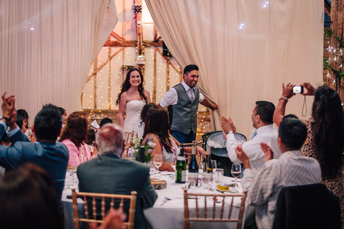 We changed back into our original outfits whilst the guests took their seats in the big reception barn. The barn was decked out in as many fairy lights as I could buy (and convince my family to wrap around pillars for me) and some delicate foliage. We had a free bar to keep them entertained for a little before we made our grand entrance to our reception.