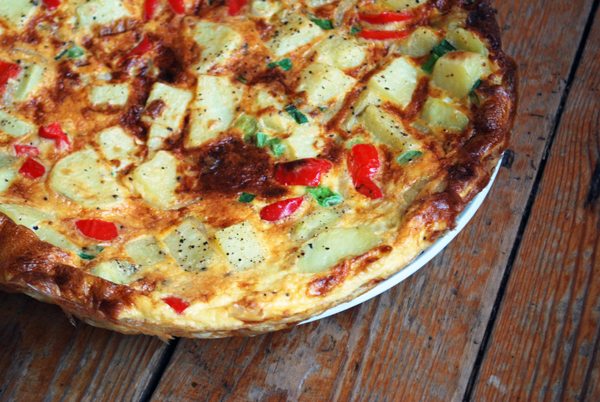 I found some potatoes languishing at the back of my cupboard and some peppers sitting lonely in the fridge yesterday. The spring onions were starting to wilt and my bowl of onion is overflowing. I racked my brains for a minutes and decided on a Spanish Tortilla to use up all my sad looking vegetables. This really is a simple recipe that you can adjust to your fancy. As long as there are eggs and potatoes involved! I used onion, garlic, pepper and potatoes and loads of eggs. I love Spanish food, the flavours really pop, in my opinion!