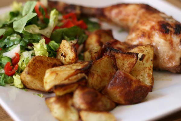 This might be the simplest recipe I have ever blogged about. In fact it is so simple it’s almost a non-recipe. But these spicy potato wedges are so damn fine that I just had to share them. Quick and easy, these potato wedges are an ideal mid-week supper side dish and as you can see I served mine up roast chicken legs and salad. But they would also be great for sprucing up your Sunday lunch!