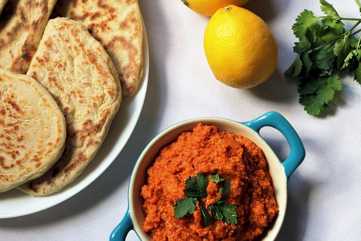 Spiced Red Pepper Houmous With Homemade Naan Bread